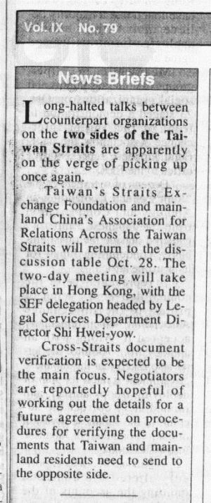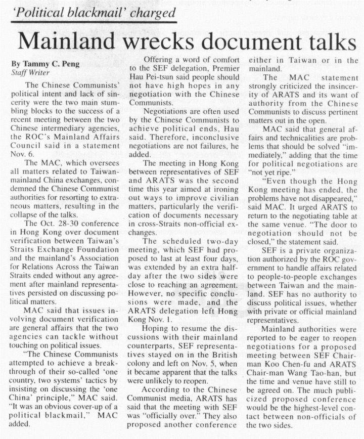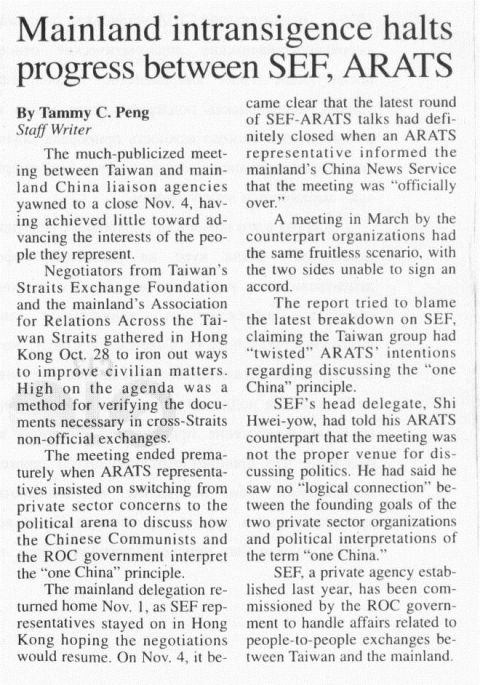 sides were close to reaching an agreement. However, no specific conclusions were made, and the ARATS delegation left Hong Kong Nov. 1.