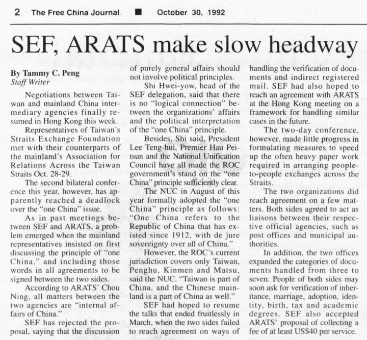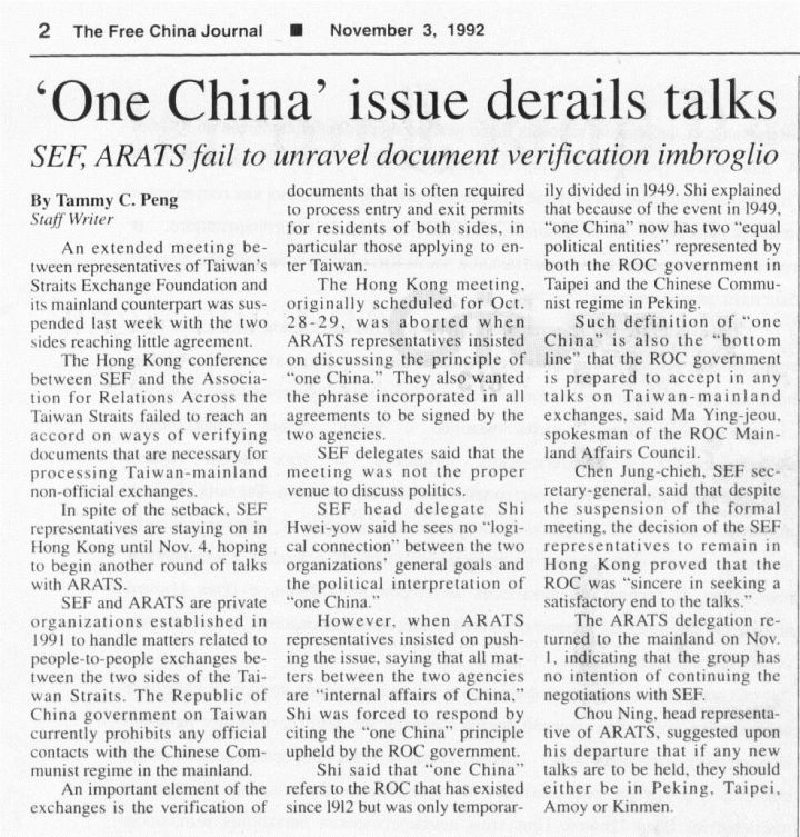One China issue was reached at the 1992 Hong Kong meeting.