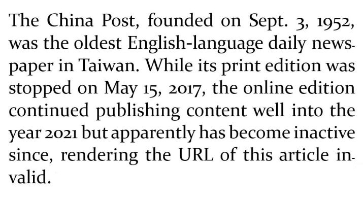 daily newspaper in Taiwan. While its print edition was stopped on May 15, 2017, the