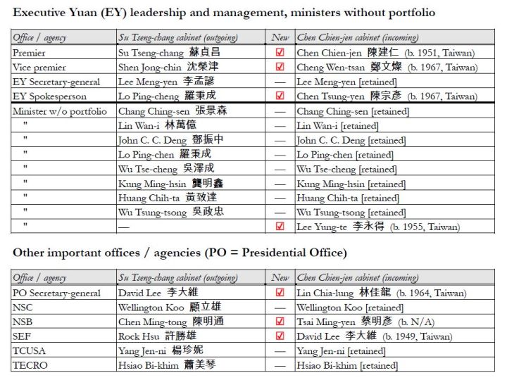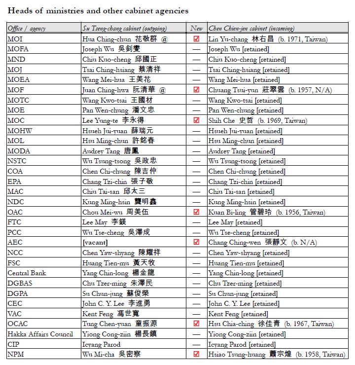 Premier Su Tseng-chang and his cabinet resign en masse, a common practice before a president is sworn in [⇥