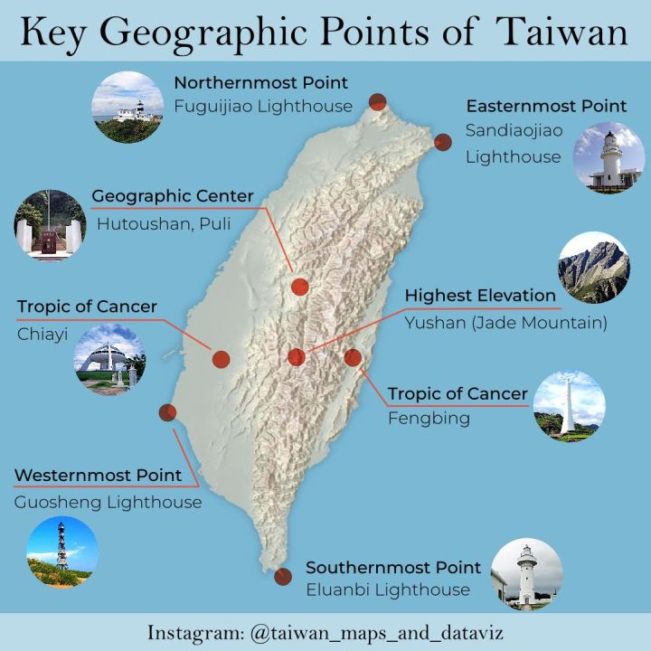 For an instructive map showing key geographic points of Taiwan, created by Taiwan-based German digital creator and blogger Alex Kunz, please click here.