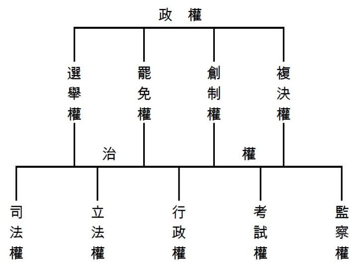 我們在政權一方面,主張四權;在治權一方面,主張五權。這四權和五權,各有各的統屬,各有各的作用,要分別清楚,不可紊亂。現在許多人都不能分別,不但是平常人不能分別,就是專門學者也是一樣的不能分別。像近來我會見了一個同志,他是從美國畢業回來的,我問他說:「你對於革命的主義是怎麼樣呢?」他說:「我是很贊成的。」我又問他說:「你是學甚麼東西呢?」他說:「我是學政治法律。」我又問他說:「你對於我所主張的民權有甚麼意見呢?」他說:「五權憲法是很好的東西呀!這是人人都歡迎的呀!」像這位學政治法律的專門學者,所答非所問,便可以知道他把四權和五權,還沒有分別清楚;對於人民和政府的關係,還是很糊塗,殊不知道五權是屬於政府的權,就他的作用說,就是機器權。一個極大的機器,發生了極大的馬力,要這個機器所做的工夫很有成績,便要把他分成五個做工的門徑。民權就是人民用來直接管理這架大馬力的機器之權,所以四個民權,就可以說是機器上的四個節制。有了這四個節制,便可以管理那架機器的動靜。政府替人民做事要有五個權,就是要有五種工作,要分成五個門徑去做工。人民管理政府的動靜要有四個權,就是要有四個節制,要分成四方面來管理政府。政府有了這樣的能力,有了這些做工的門徑,才可以發出無限的威力,才是萬能政府。人民有了這樣大的權力,有了這樣多的節制,便不怕政府到了萬能,沒有力量來管理。政府的一動一靜,人民隨時都是可以指揮的。像有這種情形,政府的威力便可以發展,人民的權力也可以擴充。有了這種政權和治權,才可以達到美國學者的目的,造成萬能政府,為人民謀幸福。中國能夠實行這種政權和治權,便可以破天荒在地球上造成一個新世界。 至於民權之實情與民權之行使,當待選舉法、罷免法、創制法和複決法規定之後,乃能悉其真相與底蘊。在講演此民權主義之中,固不能盡述也。閱者欲知此中詳細情形,可參考廖仲愷所譯之全民政治。