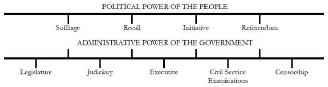 TOP HOME [◆ Three Principles] [Democracy] The Principle of Democracy: Lecture Six [April 26, 1924]WESTERN statesmen and students of jurisprudence now speak of government as machinery and of law as an instrument. A great many Chinese books on government and law are translations from the Japanese; the Japanese have given government organization the designation of chi-kuan (organ, or bureau). Chi-kuan means the same thing as the common word "machinery" in China; when we say chi-kuan we mean the same thing as machinery, an administrative organ may, therefore, be called administrative machinery. But what is the difference between political machinery and manufacturing machinery? Manufacturing machinery is made entirely of material things—wood, steel, leather belts, and such-fitted together; political machinery is constructed of human beings and depends upon human beings, not material things, for its action. So there are great differences between political and manufacturing machinery, but the one that stands out is the fact that political machinery is moved by human forces, while manufacturing machinery is moved by material forces. Western civilization and culture have been developing and progressing with great rapidity. But when we analyze this progress we find that material civilization, as represented by manufacturing machinery, has been advancing very rapidly, while human machinery, as seen in political organization, has made very slow advance. What is the reason for this? When material machinery is constructed, it can be easily tried out, the bad features can be discarded, and the imperfect parts can be improved. But after human machinery has been set up, it is not easily experimented with and improvements are not at all easily made, except through revolution. The only other way would be to treat it as scrap iron, as we do old material machinery, but this is manifestly impossible. Hence manufacturing machinery in the West has progressed by leaps and bounds, while political machinery has just stumbled along. There is nothing over ten years old among the machines used in modern agriculture, industry, and business; for every decade brings numerous inventions and improvements and every year marks some advance. Yet the political machinery of a hundred years ago is still in use to-day. The individual human beings in this machinery of human forces can change at will, but the whole organization is not easily reconstructed from the bottom up because of deep-seated habits and the close sequence of life activities. Without some sort of revolution, it is impossible in ordinary times to discard entirely the old organization. This explains the rapid advance of material machinery in the West, while political machinery advanced so slowly and with such difficulty. In two former lectures, I said that Westerners had not yet found a fundamental method of procedure in carrying out democratic government. This is because they have not experimented carefully and skillfully with their political machinery. Between the first inventions of material machinery and the machinery we see to-day there have been we know not how many thousands of experiments and improvements. This led to our modern automatic machines. The machinery of democratic government, after more than a hundred years, is limited to the power of voting; there has been no advance beyond this stage for a long time. There is no other way of controlling the men who are elected to office, whether they turn out to be worthy or incompetent. Such a condition is due to imperfections in the machinery of democracy, and consequently democratic government has not yet found a good mode of procedure and has made but little progress. If we want to improve the machinery, what shall we do? As I said in my previous lecture, we must make a clear distinction between sovereignty and ability. Statesmen and students of jurisprudence are now speaking of government as a machine and of law as an instrument, and our modern democratic age looks upon the people as the motive power in government. In the old autocratic age the king was the motive power and all the activities of the state were initiated by him. The greater the power of the government, the greater the majesty of the throne. A strong government was essential for the effective carrying out of the imperial edicts. Since the king was the power behind the machinery, a strong government organization made it possible for the king, in his exalted position, to do whatever he pleased—initiate political reforms, carry on "long-range aggressions," prepare for war, or anything else. So in the age of autocracy, increased power in the government brought advantage but no injury to the king. But in the age of democracy, people are the motive power in government. Then why are they loath to have too strong a government? Because if the government is too powerful they cannot control it and will be oppressed by it. Because they were once excessively oppressed by their government and suffered so much from it, they are trying to prevent oppression in the future by limiting the power of government. These are the early days of democracy and our methods of controlling government are also defective. The people are naturally the motive power in a democracy, but the people must also be able at any time to recall the power they set loose. Therefore the people will use only a low-powered government, for they cannot control a government of several hundred thousand horse power and will not dare to use it. The fear of powerful government among Western peoples to-day is just like the fear of powerful machinery in the old factories. As for their political machinery, however, the people are not thinking of ways to improve it and are fearful of giving it too much power lest they be unable to call the power back. Instead, they are constantly thinking of ways to limit the government until it has no chance to develop and democracy has no chance to advance.
